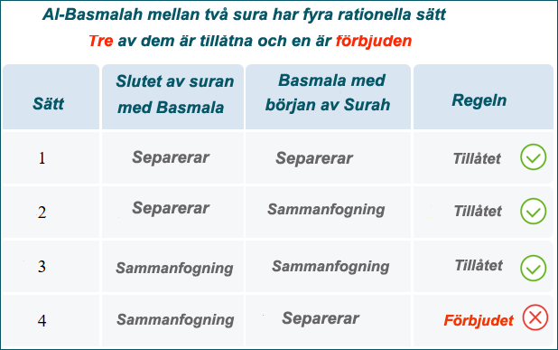 Det finns fyra sätt att slutföra en sura och fortsätta att läsa till nästa sura med Al-Basmalah mellan sig (förutom mellan surat Al-Anfal och surat At-Tawbah). Tre av dessa sätt är tillåtna och ett inte tillåtet: