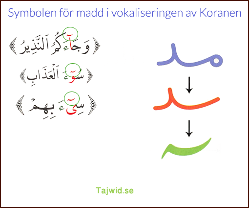 ● 1 ــ förlängningen (madden) blir ogiltig om reciteraren stannar i slutet av ordet. om reciteraren stannar upp låter det som en hā' sākin (ــهۡ), dvs du måste fortsätta till nästa ord för att låta denna madd inträffa, som i: