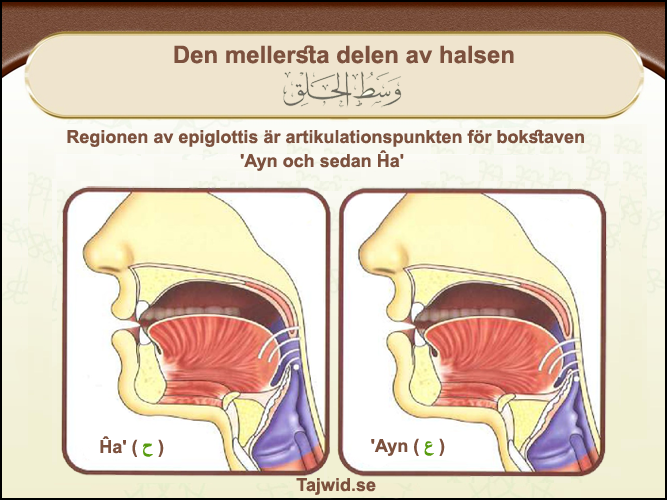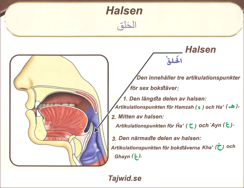 Det finns tre artikulationsställen i halsen, varje ställe har två bokstäver som frambringas därifrån: