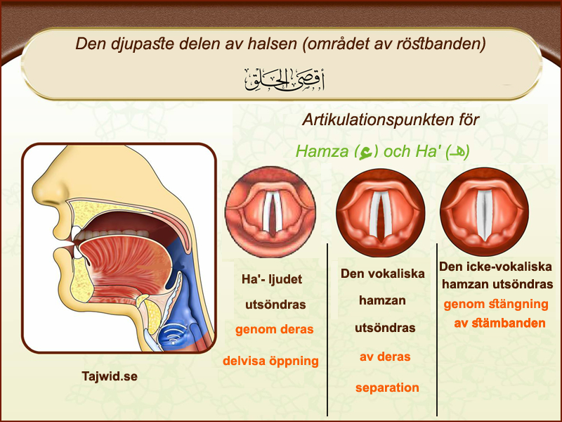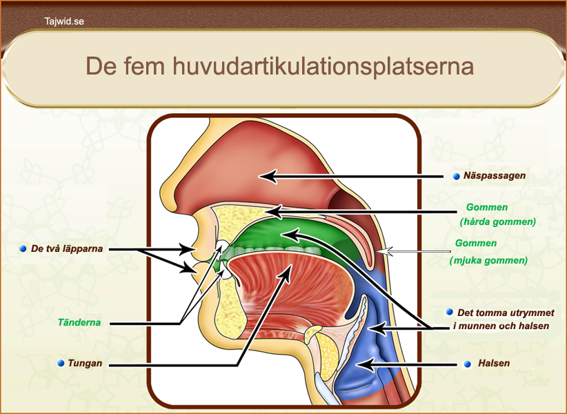 En bokstavs artikulationsplats är den plats där bokstaven uttalas, vilket innebär en ljudproduktion som kommer ut ur munnen med hjälp av en specifik artikulationsplats eller en ungefärlig sådan. Att använda rätt artikulationsplats för en bokstav är nödvändigt för att korrekt uttala bokstaven, och självklart är detta ännu viktigare när man reciterar Allahs heliga bok, den heliga Koranen.