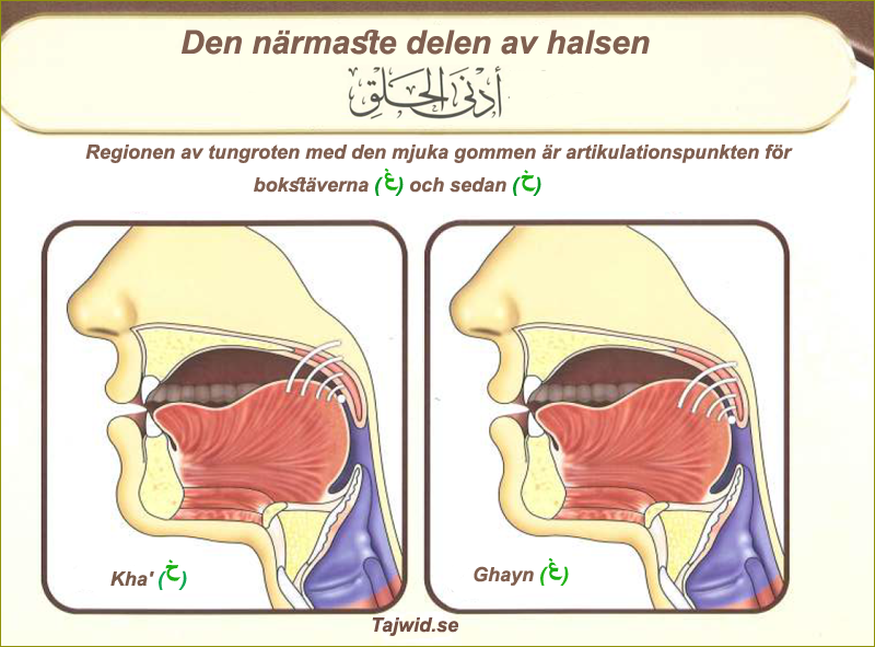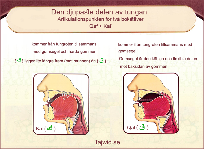 kommer från tungroten tillsammans med gomsegel. Gomsegel är den köttiga och flexibla delen mot baksidan av gommen. Bokstaven Qaf {ق}, du kan enkelt uttala det genom att öppna munnen och stänga översta delen av halsen. Se till att inte släppa ut luften från halsen, om du inte låter luften komma ut högt.
