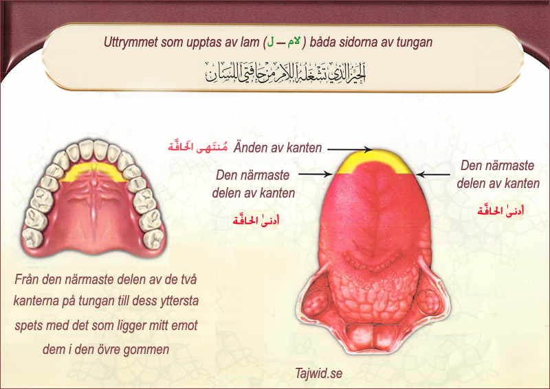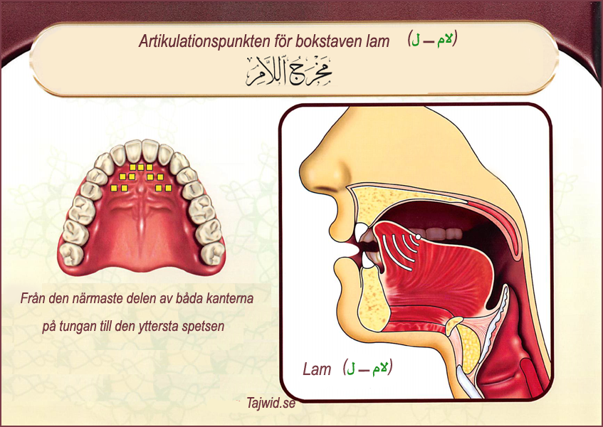 Bokstaven Lām ( لام - ل - لُ - لَ - لِ ) uttalas från tungans främre kant mot gommen av de två premolarerna, hörntänderna samt framtänderna.