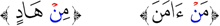 Det andra ordet i denna āyah ﴾مَنۡۜ﴿ slutar med en nūn sākinah, och den första bokstaven i nästa ord är (Rā' — ر).