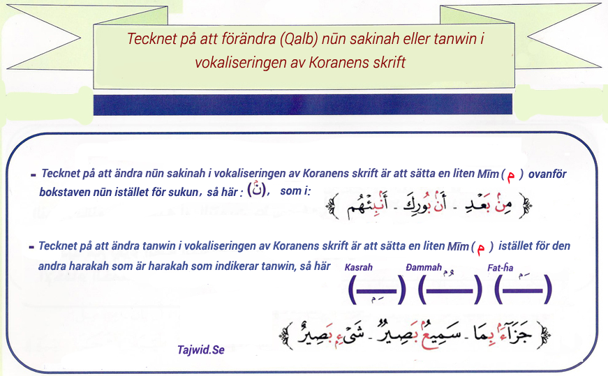 När du tillämpar Qalb- regeln, se till att inte uttala (Mīm — م) på ett intensivt sätt som liknar Mīm Saakina i fallet med (Iđhār الإظهار) Observera skillnaden i att uttala Mīm i dessa två exempel: