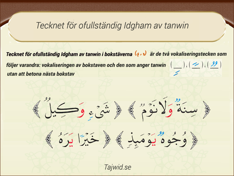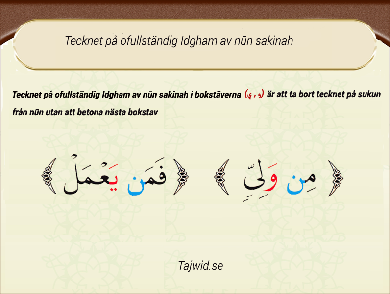 1. Tecknet på ofullständig Idgham av nūn sakinah i bokstäverna (و, ي), är att ta bort tecknet på sukun från nūn utan att betona nästa bokstav