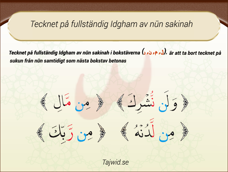 1. Tecknet på fullständig Idgham av nūn sakinah i bokstäverna (ل, م, ن, ر), är att ta bort tecknet på sukun från nūn samtidigt som nästa bokstav betonas