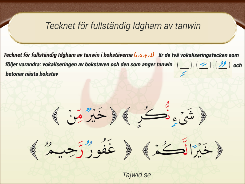 2. Tecknet för fullständig Idgham av tanwin i bokstäverna (ل, م, ن, ر), är de två vokaliseringstecken som följer varandra: