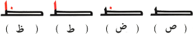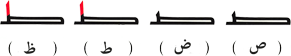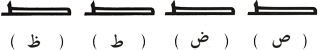 1. De fyra tunga bokstäverna (şād, đād, ţāʾ, žāʾ) skrevs ursprungligen likadant när de var kopplade till en efterföljande bokstav, exempelvis:
