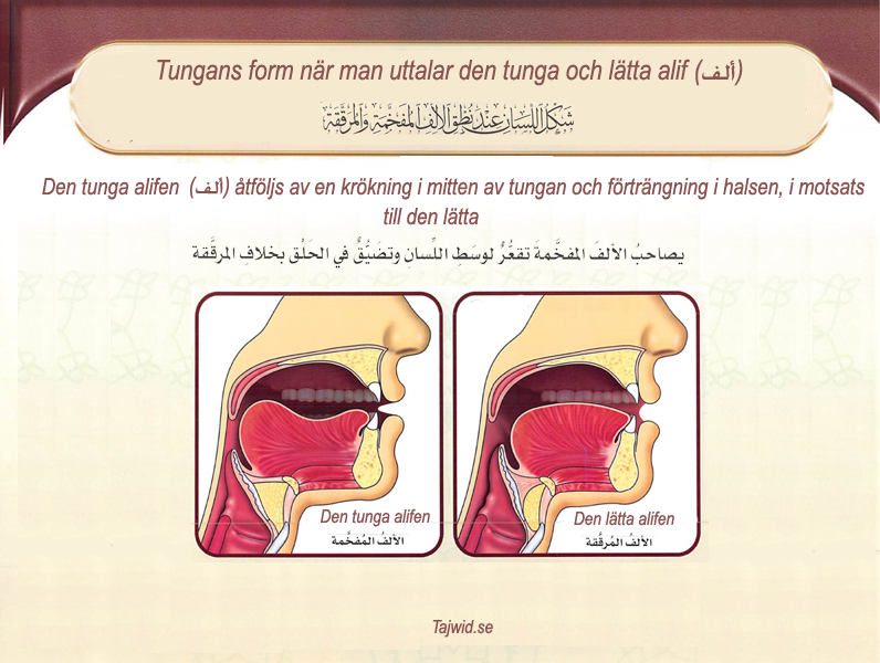 ــ Om bokstaven före den är tung, så uttalas alifen tnngt som: ﴾وَلَا ٱلضَّآلِّينَ﴿, så (đād — ض) är tung, och alifen efter den uttalas tungt.