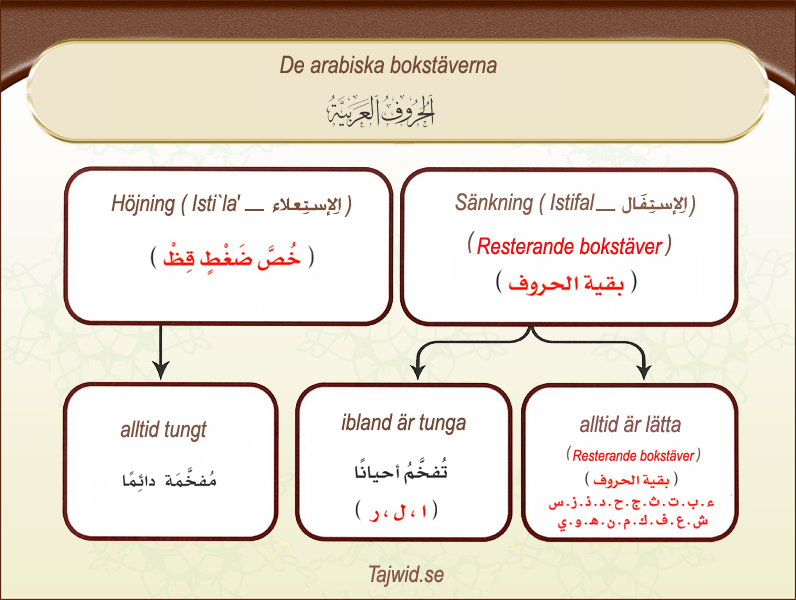 Nivåer av Tafkhim (التَّفخيم) av de förhöjda bokstäverna (Isti`la' — الإِستِعلاء)