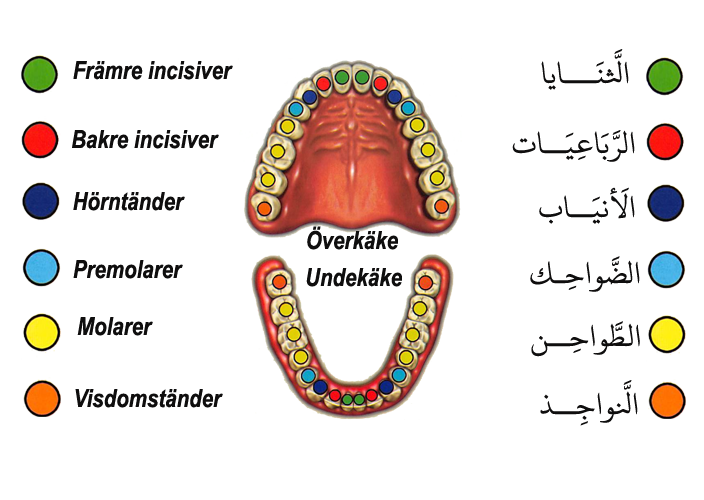 Hörntänderna ( الأنيَاب ) är fyra, två i respektive käke. Premolarer eller främre kindtänderna ( الضَّواحك ) är åtta i antal, fyra i respektive käke. Därefter har vi 12 molarer, även kallade bakre kindtänder ( الطَّوَاحِن ), tre på varje sida i underkäken respektive tre på varje sida i överkäken.